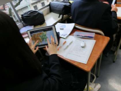 地理の学習で、「関東地方の特徴」をタブレットを使って、国土地理院のHPから調べて、プリントの課題をやっています。