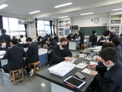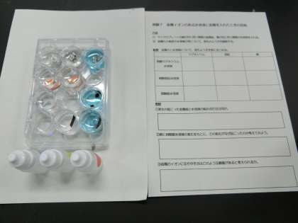 「金属イオンのある水溶液に金属を入れるとどうなるか」という実験を3〜4人1組で、実験を行っています。どのように変化をしているか観察しています。