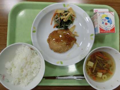 ご飯 ・沢煮椀 ・松風焼き ・カリカリ油揚げ入りおひたし ・牛乳です。