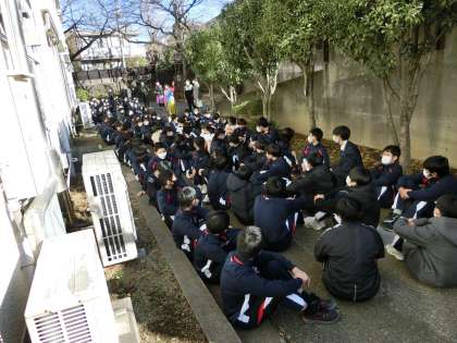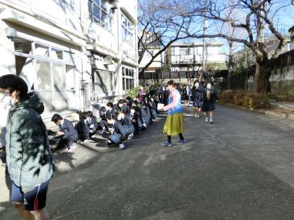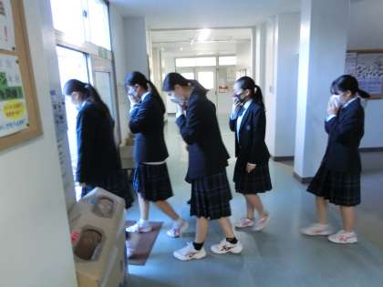 今日は、保健室から出火の設定で、避難訓練を行いました。校庭には、避難できないので、東校舎の裏に避難しました。みんな「お・か・し・も」を守って、口にハンカチを当てて、速やかに避難できました。