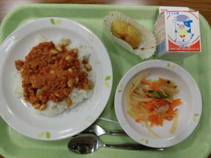 スパイシートマトライス ・大根サラダ ・スイートポテト ・牛乳です。