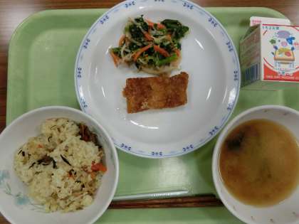 磯おこわ ・みそ汁 ・いかの竜田揚げ ・ごま和え ・牛乳です。