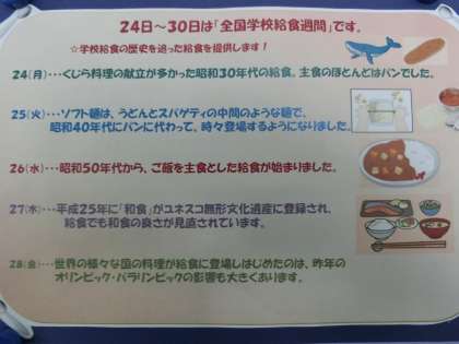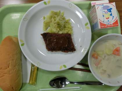 コッペパン+はちみつ ・ホワイトシチュー ・くじら揚げ ・炒めキャベツ ・牛乳です。