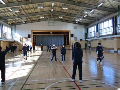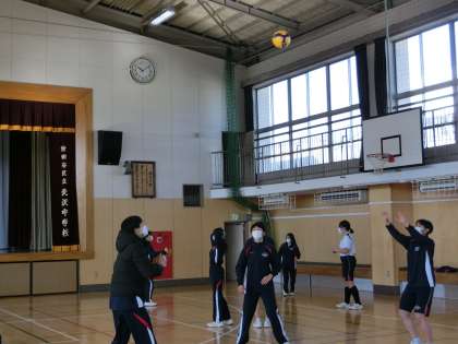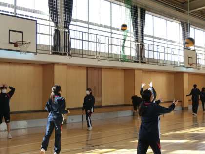 「バレーボール」の授業の3回目で、トスの練習を向き合って行っています。バレー部の生徒が指導に回っていました。