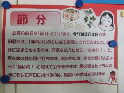 今日は「節分」です。1階の玄関入った給食のエレベーター室の横の掲示見ましたか?