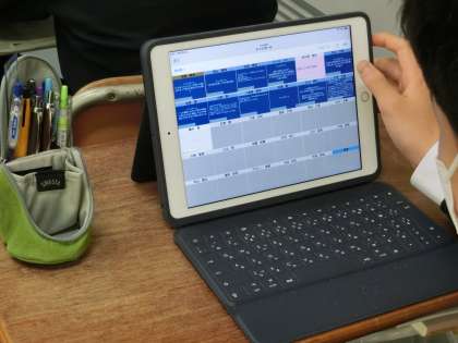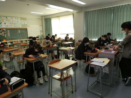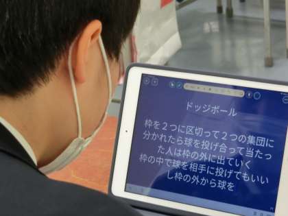 「ドッヂボール」を日本語で説明しようということで、各自タブレットに書き込んで、ロイロノートで送って共有しています。なかなかユニークな答えが沢山・・・