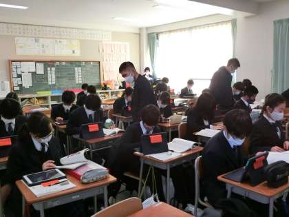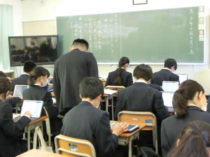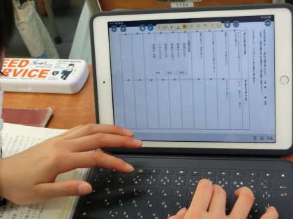 ヘルマン・ヘッセの「少年の日の思い出」で、主人公の「僕」の心情を教科書を見ながら、先生から送られてきたタブレットの課題に、入力しています。