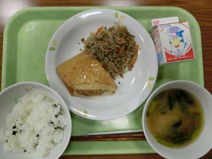 わかめご飯 ・みそ汁 ・生揚げの肉づめ ・白滝のきんぴら ・牛乳です。