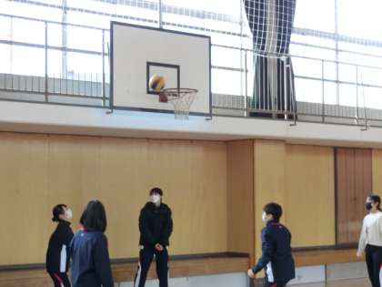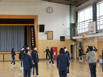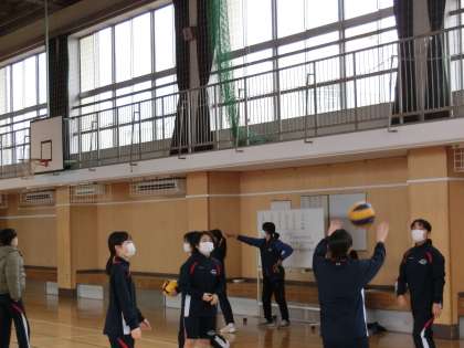 グループごとに輪になって、レシーブの練習をしています。これから試合です。
