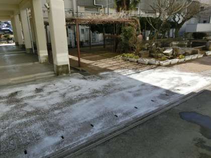 天気予報では、朝方から雪が降り、前回のように大雪警報が出るかも・・・というので、主事さんに、明日の朝、生徒が登校時、雪で転ばないように、エンカルを大盛りでまいてもらいました。