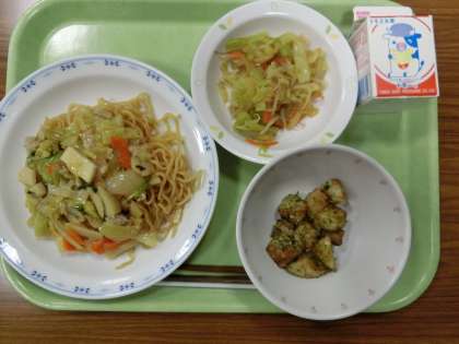 五目あんかけ焼きそば ・青のりポテト ・野菜の中華味 ・牛乳です。