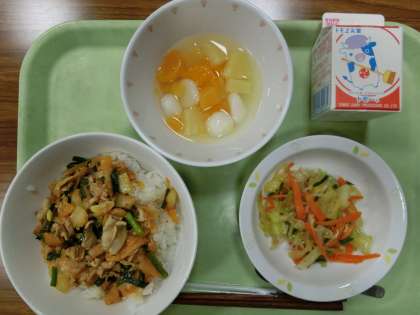 豚キムチ丼 ・こんにゃくサラダ ・白玉フルーツポンチ ・牛乳です。 今日は、3年生リクエスト給食です。