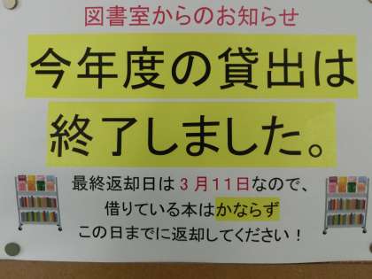3年生で本を借りている人は、早く返却してください。