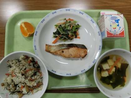ひじきご飯 ・すまし汁 ・鮭の香味焼き ・ごま和え ・せとか・牛乳です。