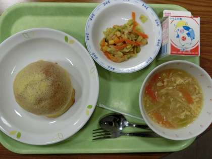 ビスキュイパン ・卵と野菜のスープ ・キャベツとコーンのサラダ ・牛乳です。