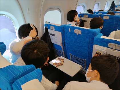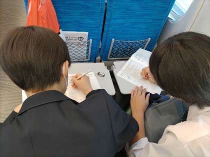 車内ではカードゲームをしたり、課題に取り組んでいる人がいます。もうすぐ熱海です。