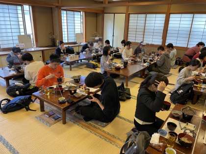 お昼は鳥久さんで焼肉唐揚げ御膳を。みんな黙々と食べています。デザートにはアイスクリームも。