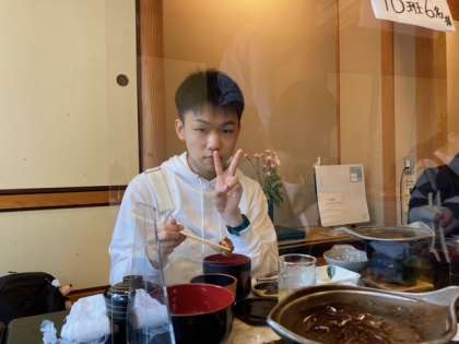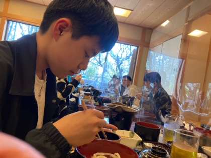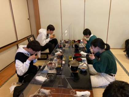 「鳥久」さんでの昼食です。おいしいお肉でエネルギーも充分。午後の班活動が楽しみです。