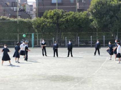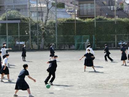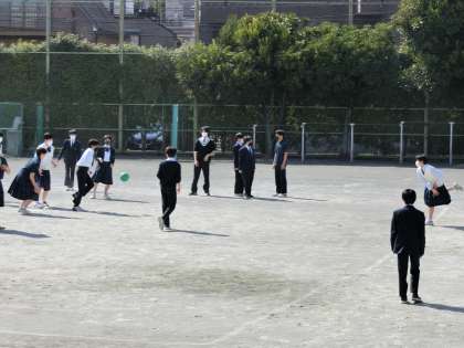 3年生が修学旅行でいないので、校庭のど真ん中で1年生が男女でドッヂボールを行っていました。