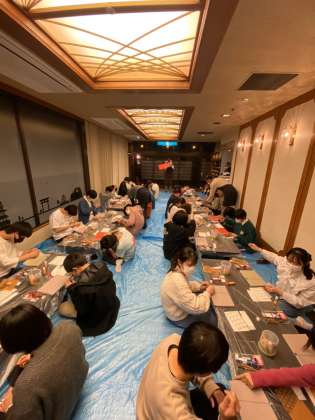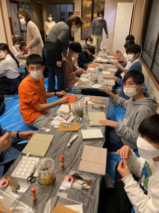 夜ご飯の後は、和本製作です。伝統的な本の綴じ方を学んでいます。表紙の絵は、自分で描きます。