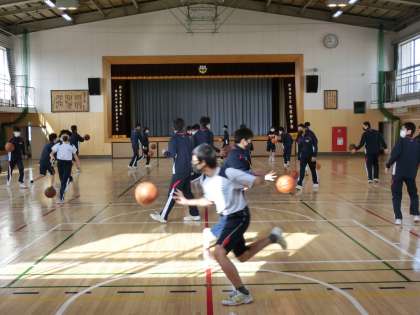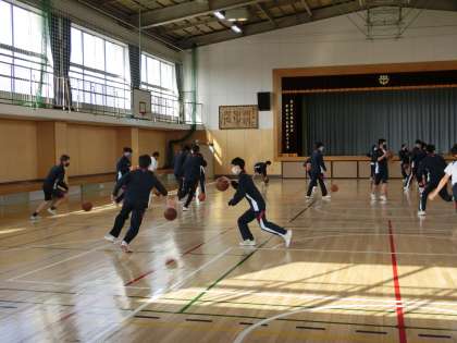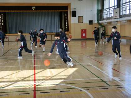 体育館でバスケットを行っています。