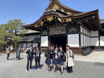 各班ごとにタクシー移動しています。二条城に来ていた班をパシャリ。写真撮影のときは話さずに