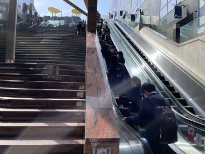 昼食を食べ終え、京都駅に着きました。今から京都駅散策をします。階段を全力で登っていく人も。
