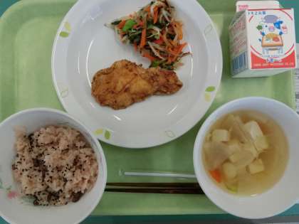 赤飯 ・すまし汁 ・鶏肉の唐揚げ ・磯和え ・牛乳です。