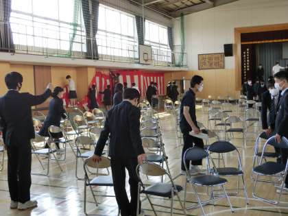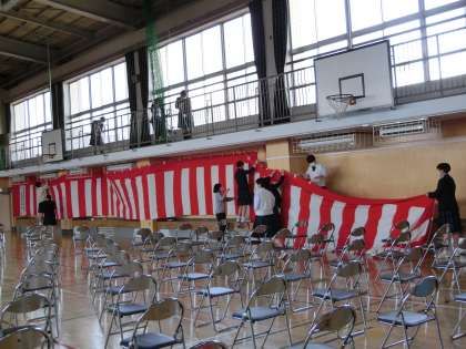 式場を作っています。椅子を並べ、紅白幕を張り、舞台の設営をしています。