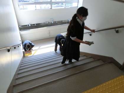1年生は、保護者の上がってこられる階段を雑巾がけ。みんな本当によく働いてくれます。