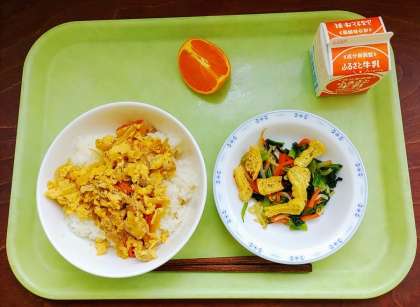 親子丼・カリカリ油揚げ入りおひたし・くだもの(せとか)・牛乳でした。