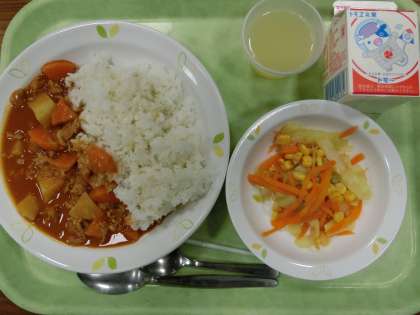 ハッシュドポークライス ・コーンサラダ ・りんごゼリー ・牛乳です。