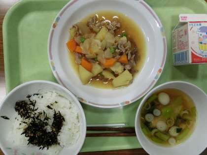 ご飯・ひじきふりかけ・みそ汁・肉じゃが・牛乳です。