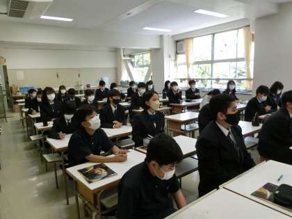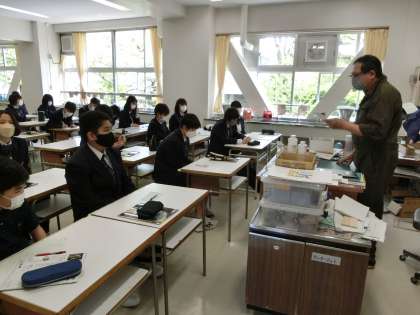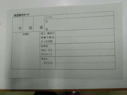 今日は最初なので、各自「自己紹介カード」に先生の説明を聞きながら、記入をしています。自分の似顔絵を描くところもあります。どんな風に描けるか楽しみです。