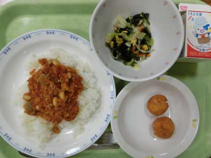 スパイシートマトライス・海藻サラダ・おからドーナツ・牛乳です。