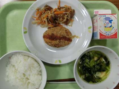 ごはん ・きんぴらコロッケ ・糸こんにゃくともやしの和え物 ・牛乳です。