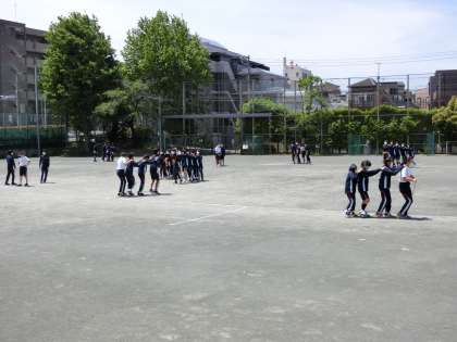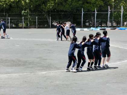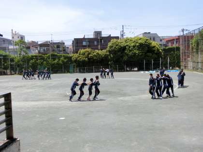 晴れたすがすがしい校庭で、「こむかで」の練習をしています。