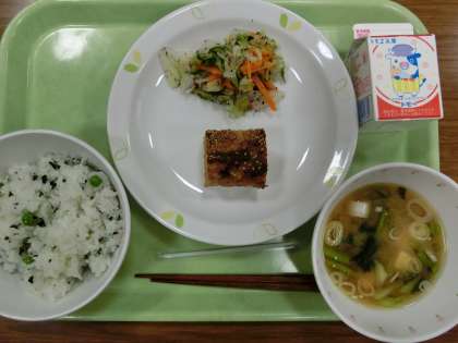 わかめ入りグリンピースご飯 ・松風焼き ・野菜とゆかり和え ・豆腐とねぎのみそ汁 ・牛乳です。