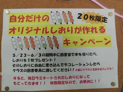 今回は「自分のオリジナルしおりが作れる」キャンペーンです。20枚数限定です。