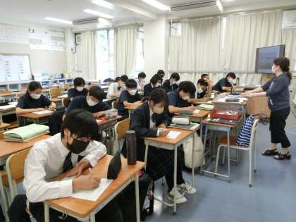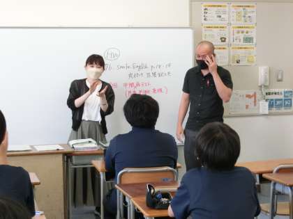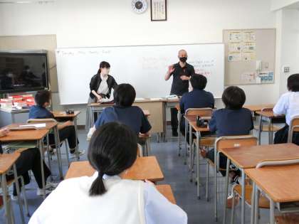2年生少人数英語にステイーフン先生がいらっしゃいました。もう一つのクラスは中間テスト前のシンガポール旅行の単元について、各自意見を書いています。