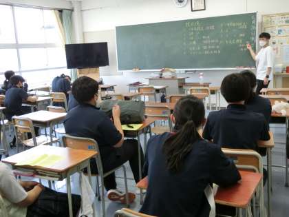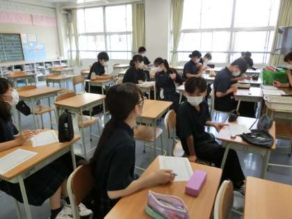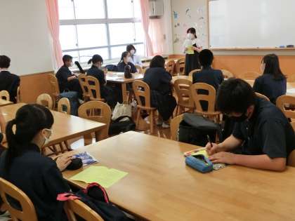 第1回の運動会の係会を行っています。プログラムに自分の担当の係を記入し、仕事の確認をしています。