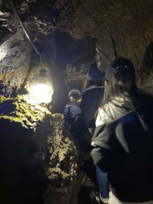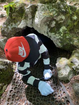 河口湖フィールドセンターでは、樹海を五感で味わいます。小さな溶岩樹型の通り道をかがんで進みます。