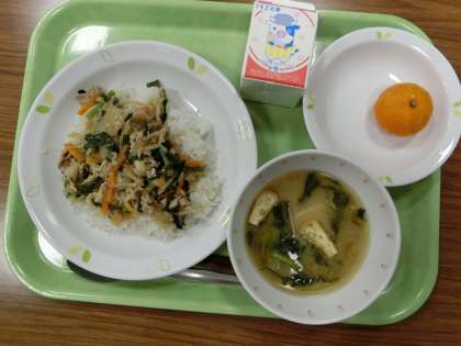スタミナ丼 ・具だくさんみそ汁 ・冷凍みかん ・牛乳です。