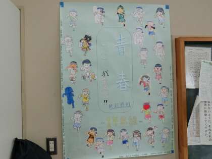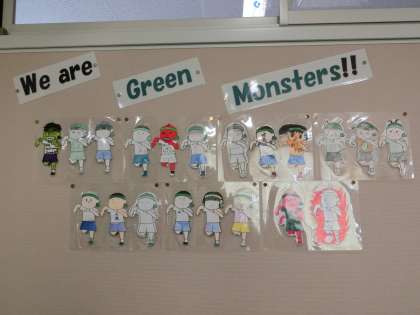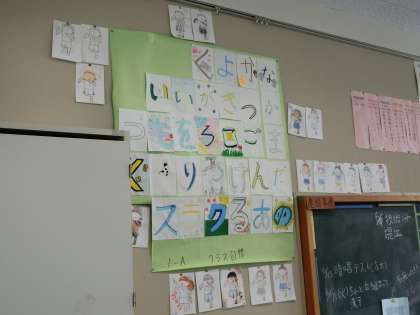 1年生の教室にも、走っている人のイラストの胸に各自の思いが書いたものが掲示されています。