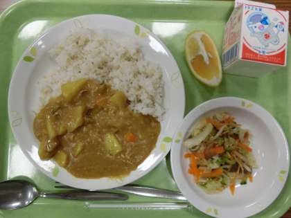 ポークカレーライス ・こんにゃくサラダ ・河内晩柑 ・牛乳です。