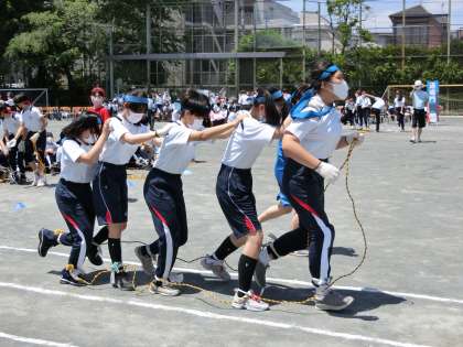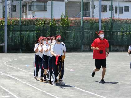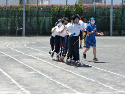 3年生学年種目むかで。担任の先生は、むかでと一緒に校庭を何週も掛け声かけながら、走りました。