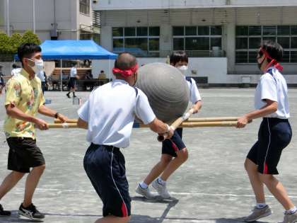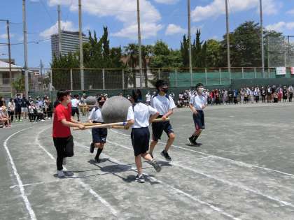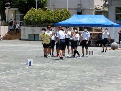 生徒会種目。まずは箱の中からどうな条件の人を見つけてくるかを引いて。探して、一緒にボールを竹の棒で挟んで、1周します。
