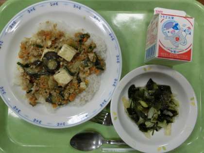 まーぼーなす丼 ・わかめと糸寒天のサラダ ・牛乳です。
