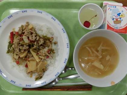 青椒肉絲丼 ・ひすいスープ ・さくらんぼゼリー ・牛乳です。