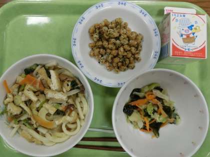 きつねうどん ・大豆の磯揚げ ・キャベツとわかめの梅和え ・牛乳です。